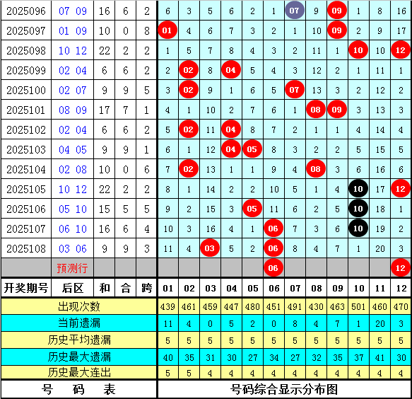 和值跨度:上期和值开出106,对比第2025107期和值高潮了38个点位,本期看好和值走小,温雅小 号区域和值,展望在83隔邻。