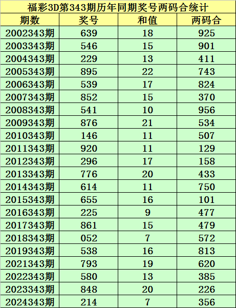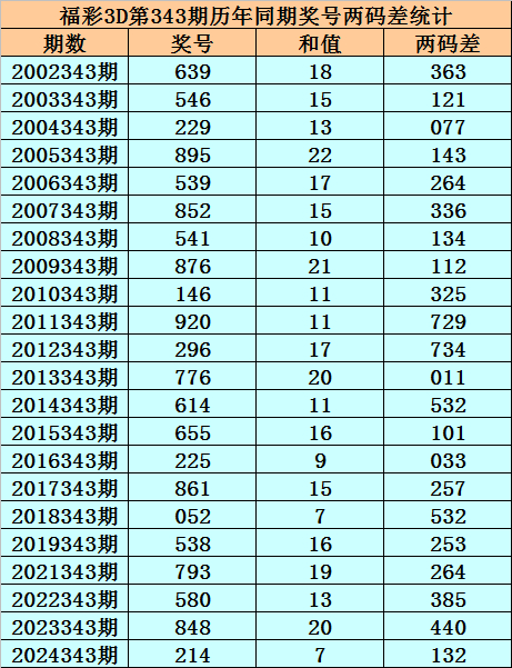 福彩3D第343期,历史上期开出22次奖号,其奖号永诀为:639、546、229、895、539、852、541、876、146、920、296、776、614、655、225、861、052、538、793、580、848、214,奖号两码合差永诀开出: